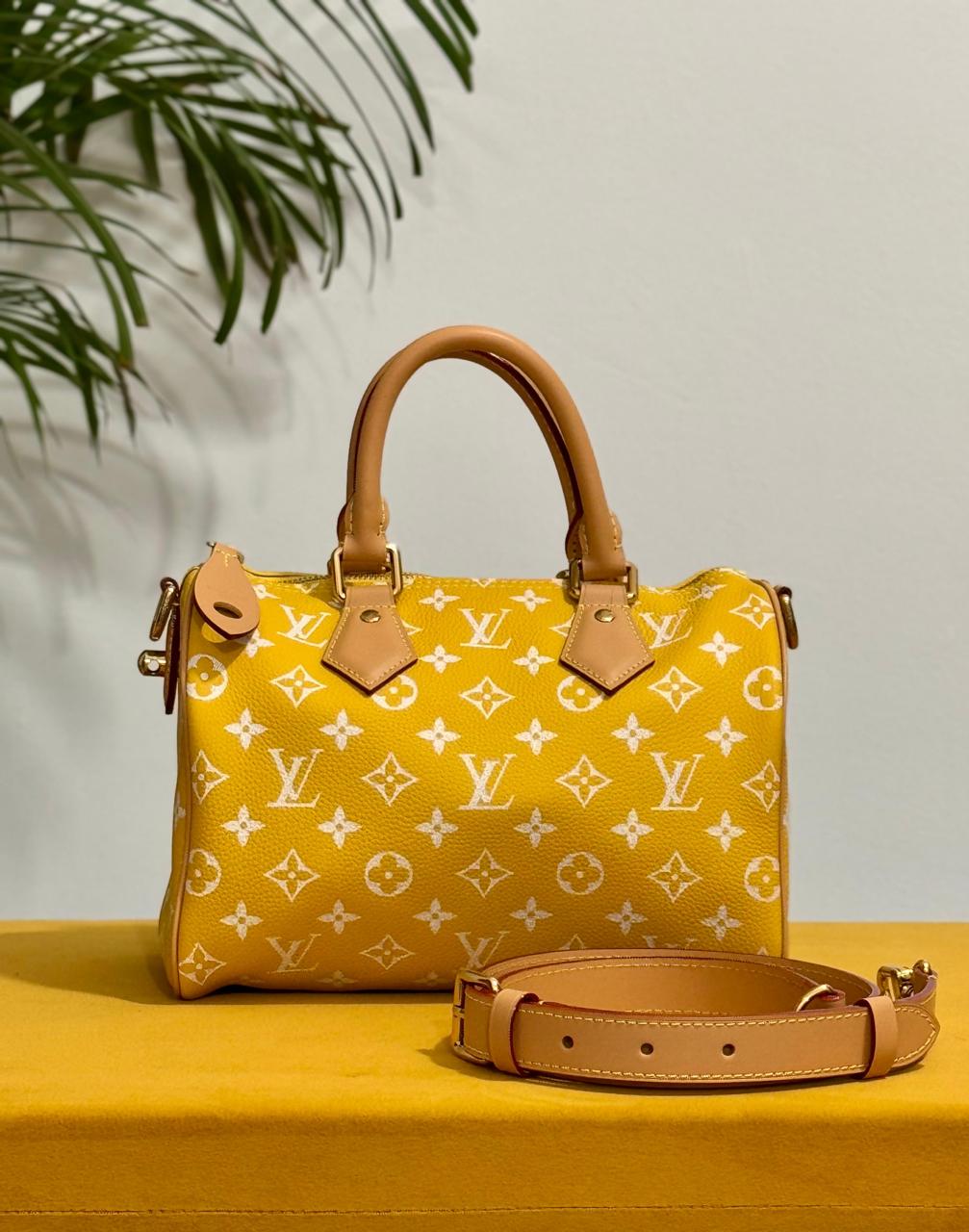Part of an exclusive collection, this Speedy P9 Bandoulière 25 represents a modern evolution of the legendary silhouette first designed in 1930. Sculpted from high-end soft calfskin, the bag is designed to be body-friendly, offering a uniquely supple feel compared to traditional canvas models. The vivid yellow hue is complemented by a high-end silk-screen Monogram print, designed to acquire a refined, vintage-inspired look as it ages.