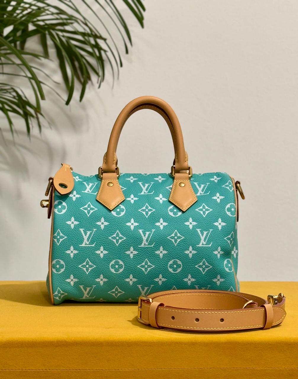 Part of an exclusive collection, this Speedy P9 Bandoulière 25 reimagines the legendary silhouette first designed by Gaston-Louis Vuitton in 1930. Crafted from exceptionally soft, high-quality calfskin, this bag is distinguished by its saturated turquoise colorway and a monogram print designed to acquire a refined, vintage-inspired look over time.