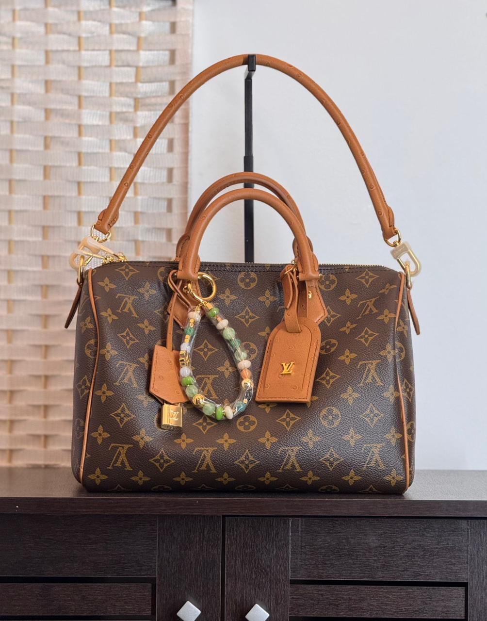 A bohemian reimagining of a timeless icon, the Louis Vuitton Speedy Soft 30 Boho features a relaxed, slouchy silhouette in classic Monogram coated canvas. Accented with exclusive ostrich-leather trim and a vibrant, removable pearl chain, this versatile bag offers a trendy twist on heritage luxury.
