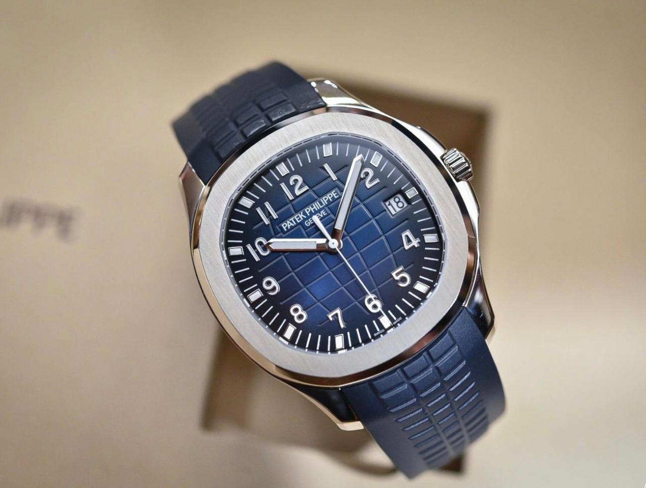 A modern, masculine icon of “casually elegant chic,” this 18K white gold Aquanaut features a 42.2mm “Jumbo” case and a striking embossed blue dial with a black-gradient rim. It is powered by a self-winding mechanical movement and paired with a durable, matching blue composite strap.
