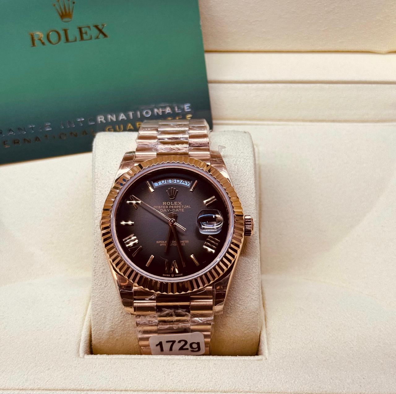 Meticulously crafted from premium materials . the Day-Date showcases Rolex’s commitment to excellence in both design and performance. Its classic round case, fluted or smooth bezel, and the legendary President bracelet create a look that is instantly recognizable and endlessly admired.